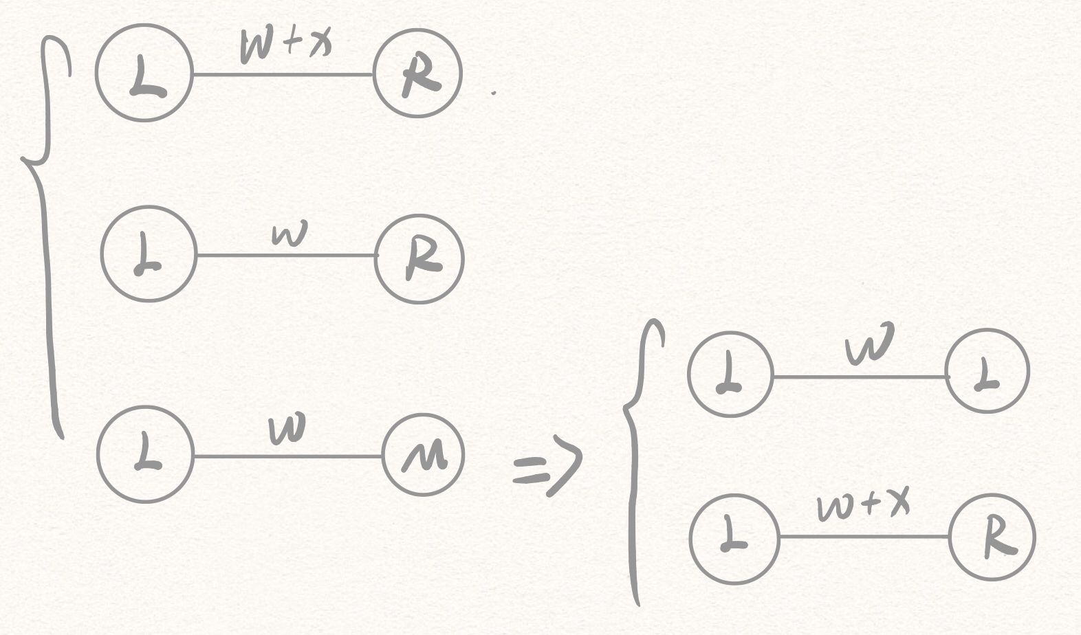 后来补题学习了隔壁队wmh哥哥的思路,dijkstra的函数不变,原模原样地跑。改变存图方式,读入某条边的时候,如果明确两端的城市的方向属性不同,则直接给这条边的权值加上换手时间x。如果其中一段的城市的方向属性为中性的M,则新建一个点,原来的点可以设其方向属性为左,新建的点设其方向属性为右,然后分别建这两条边。说起来很晦涩,直接上图: