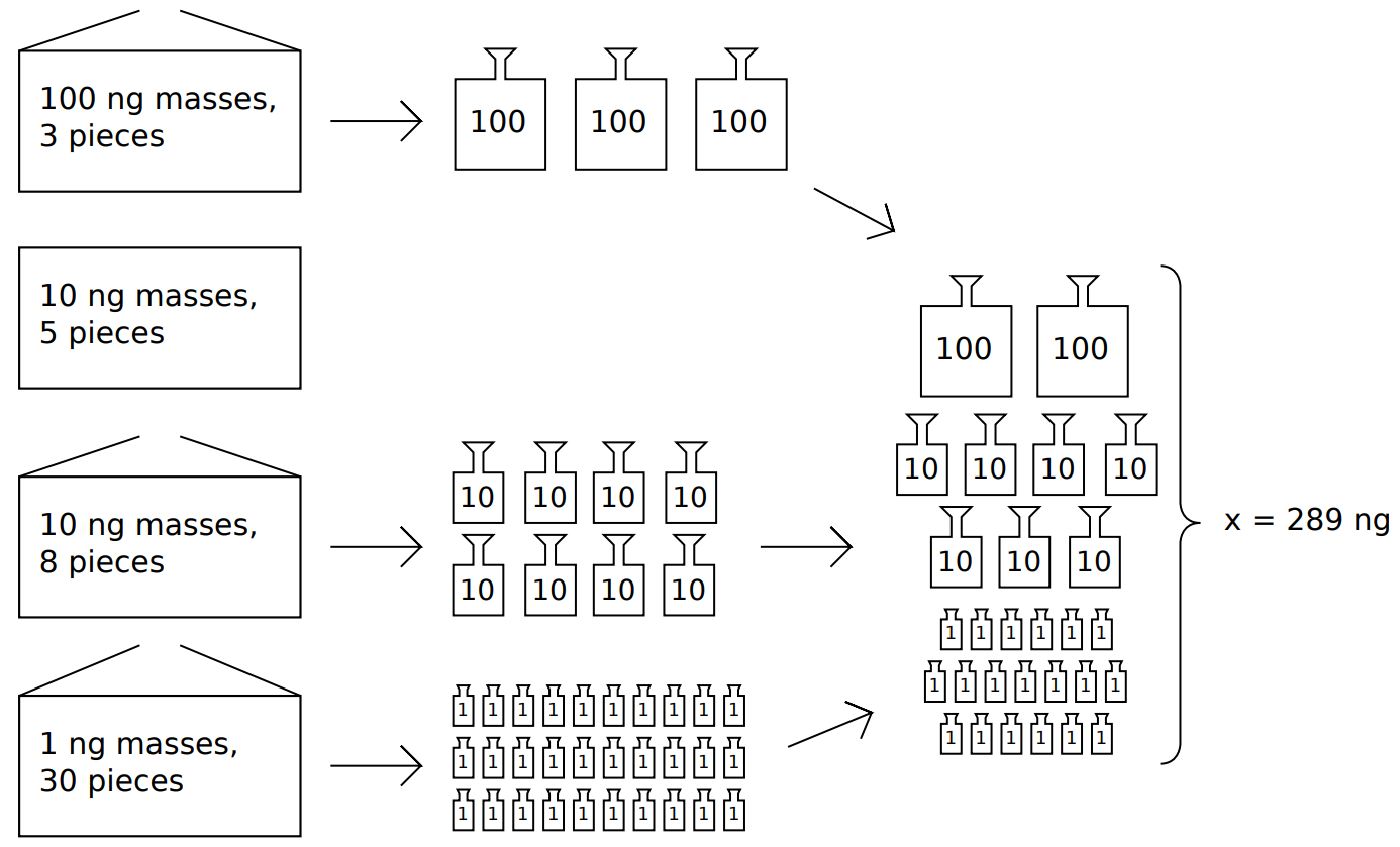 题解: 通过图我们就要很明确一点,小砝码数量足够多时可以替代大砝码,而大砝码无法替代小砝码。所以我们需要从X的个位,逐位寻找合适砝码。可将10k 单位重量的砝码放入K队列中,为满足使用最少的箱子的原则,给所有的箱子都做上是否打开的标记,已打开的优先使用,其次是砝码数量较多的优先使用。而K位上用剩下的砝码,则可以插入K+1队列中使用。