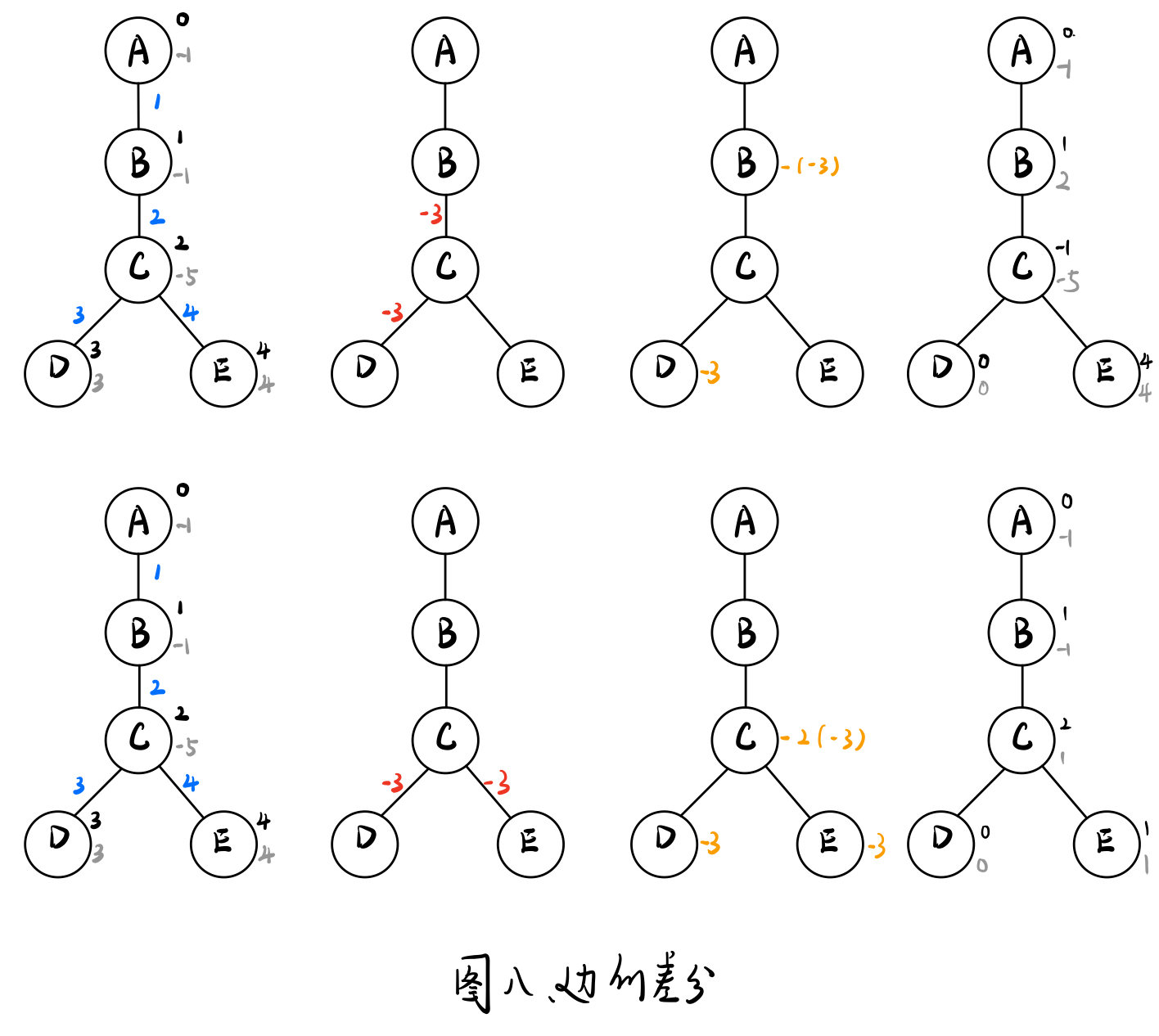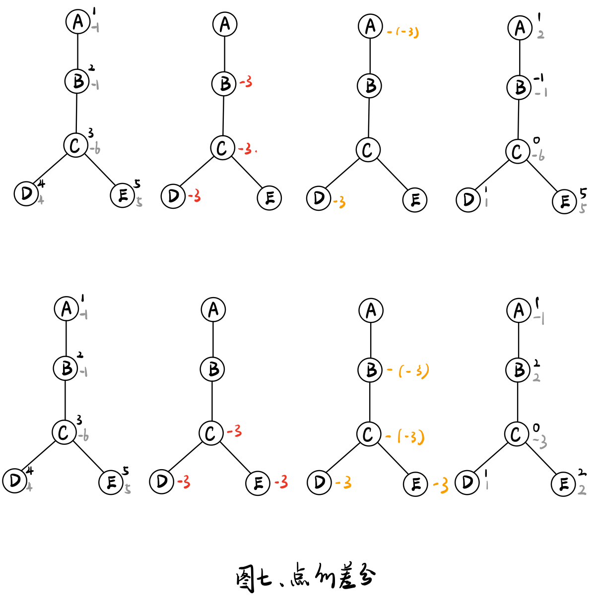 理解完差分以后,我们需要将差分试着应用到树上,这才是我们今天的课题。那对于一棵有可能有很多分支的树,我们的差分也只能是对于某一条分支的。【不再啰嗦,直接上图,只要记住两种差分的区别然后能过应用即可】