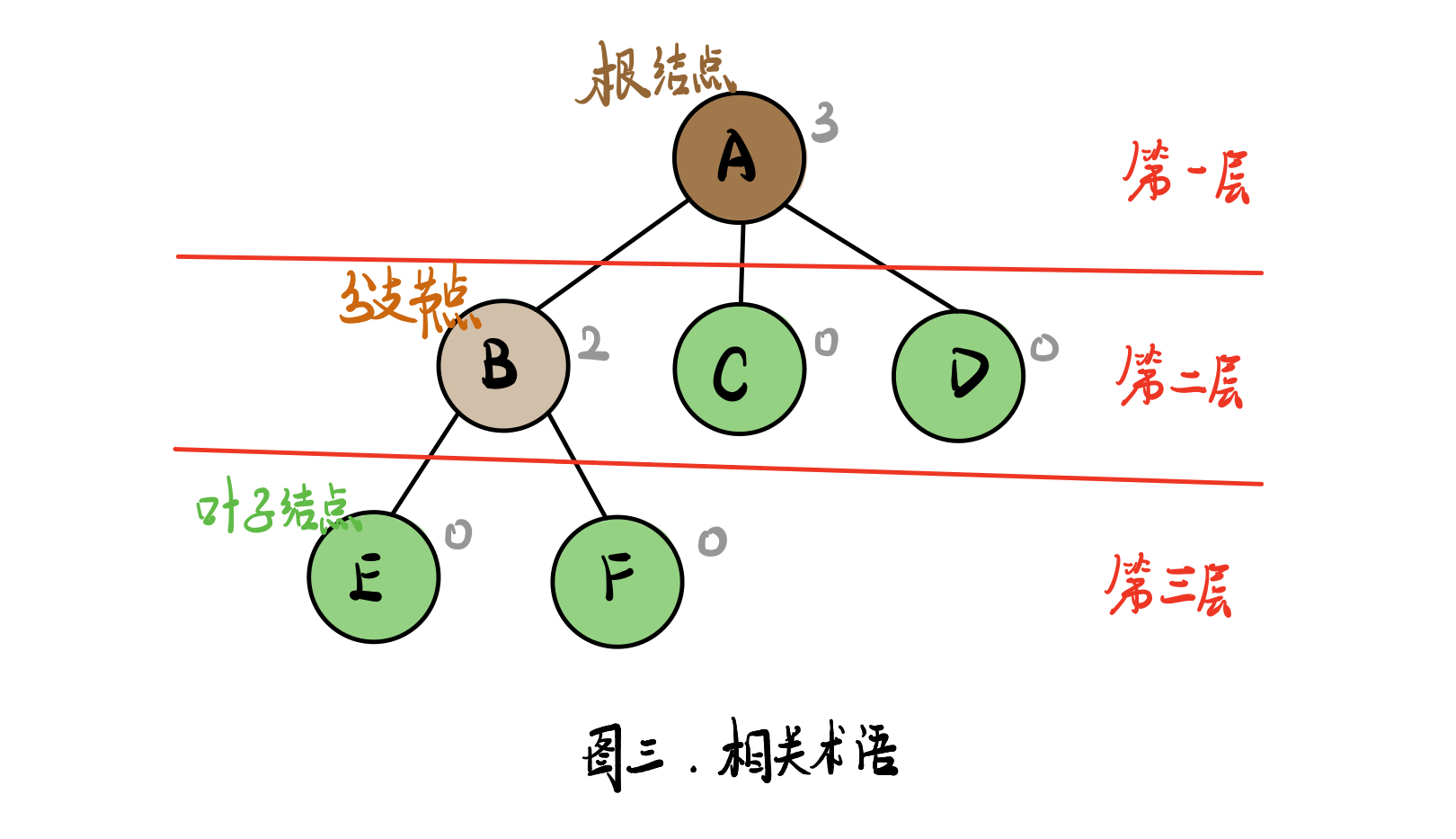 - 叶子结点:也称为终端结点,没有子树的结点或者度为零的结点