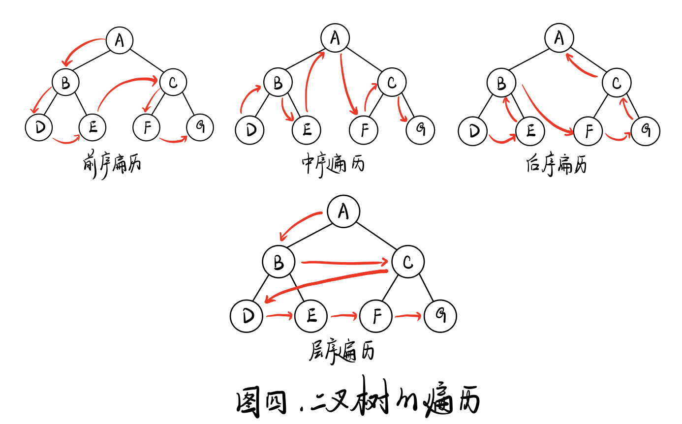 前、中、后 三序遍历,针对的是根节点的位置。根-左-右即前序遍历【所谓先遍历根节点,所以是前序】;左-根-右即中序遍历;左-右-根即后序遍历;而层序遍历则是按层数从低到高,从左到右的顺序遍历。